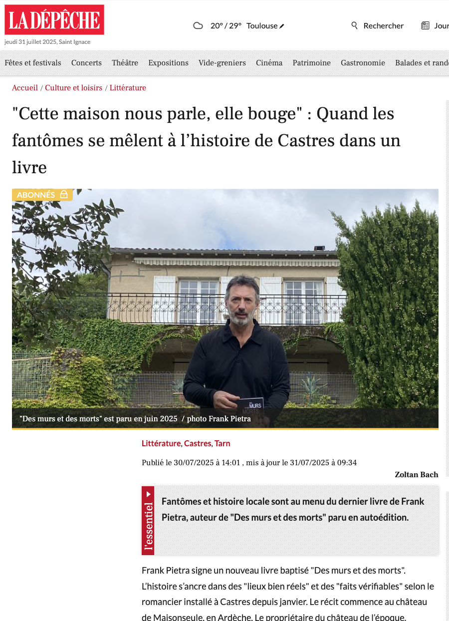 Dans un article paru aujourd’hui, La Dépêche titre : « Cette maison nous parle, elle bouge » et salue ce roman qui mêle patrimoine, mémoire et présence fantomatique.
